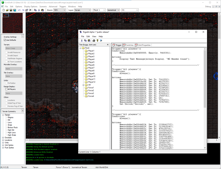 To create the custom map I used a third party map maker called ScmDraft 2 because it includes a tool called trigedit to edit the triggers in the map using a text-based language instead of the normal GUI-based workflow in the official map editor.